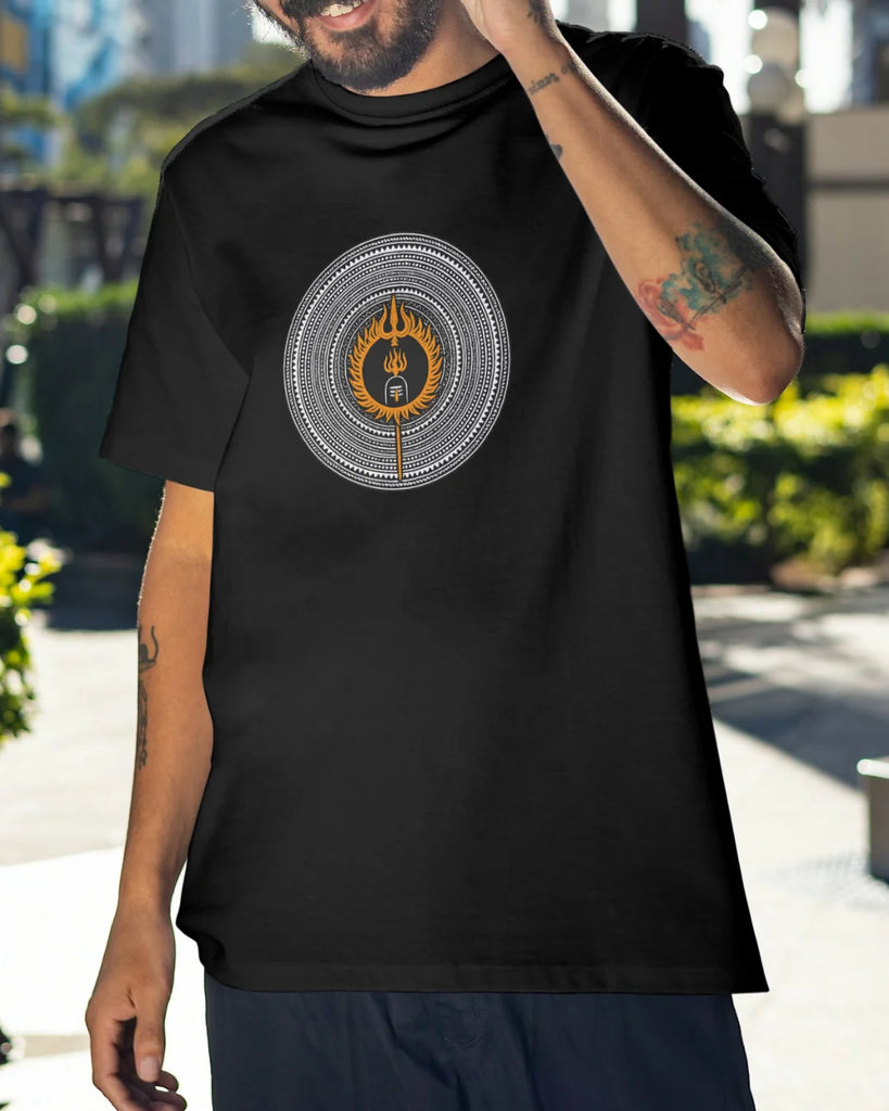 Print: A divine artwork featuring the Shivling, encircled by fiery energy and cosmic mandala strokes. The Trishul and Agni flame radiate from the center, symbolizing creation, preservation, and destruction. A sacred design that brings spiritual depth and power to your attire.