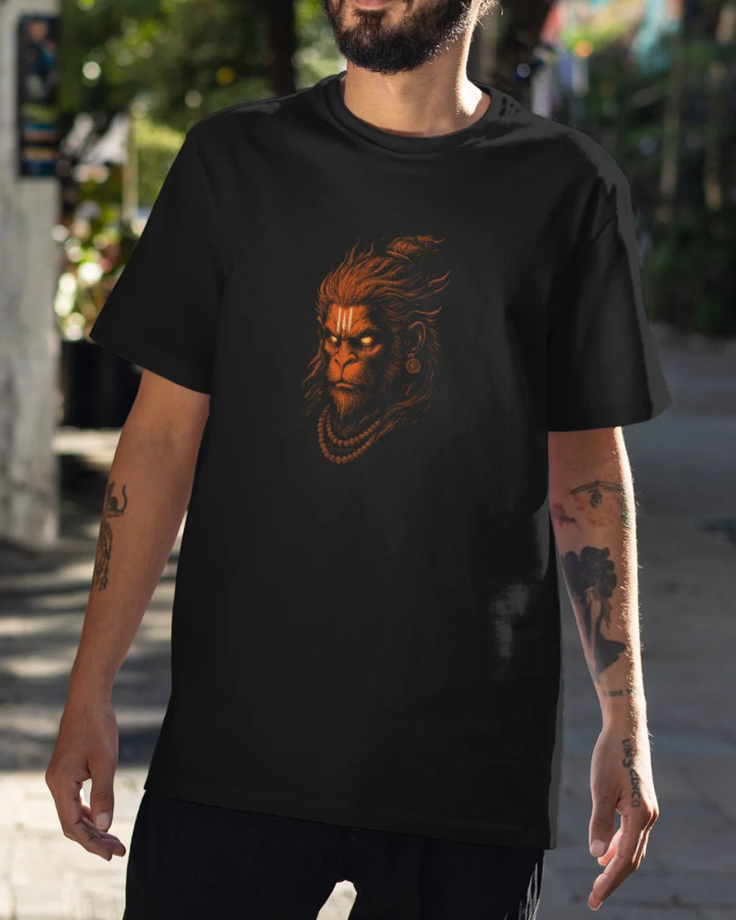Print: A fierce portrayal of Lord Hanuman, this design captures his unyielding spirit with blazing eyes and flowing hair. Perfect for those who embody strength, devotion, and fearlessness.