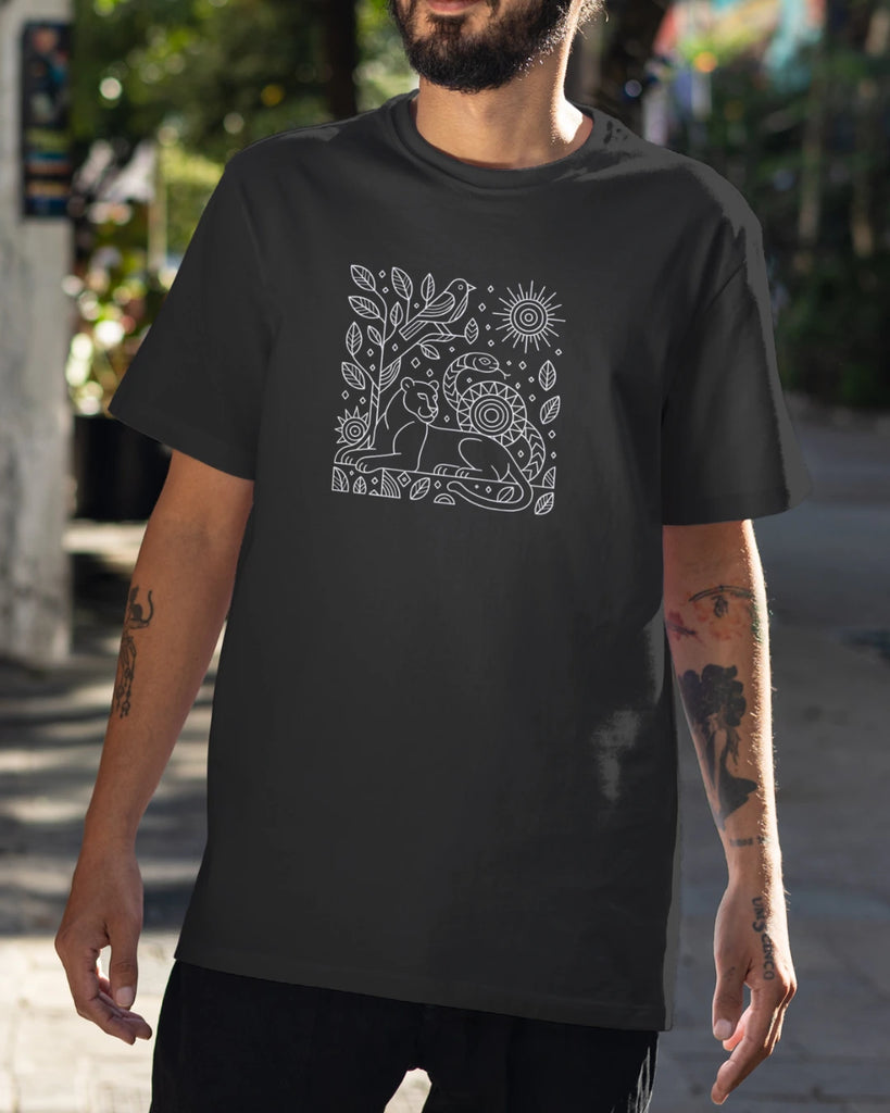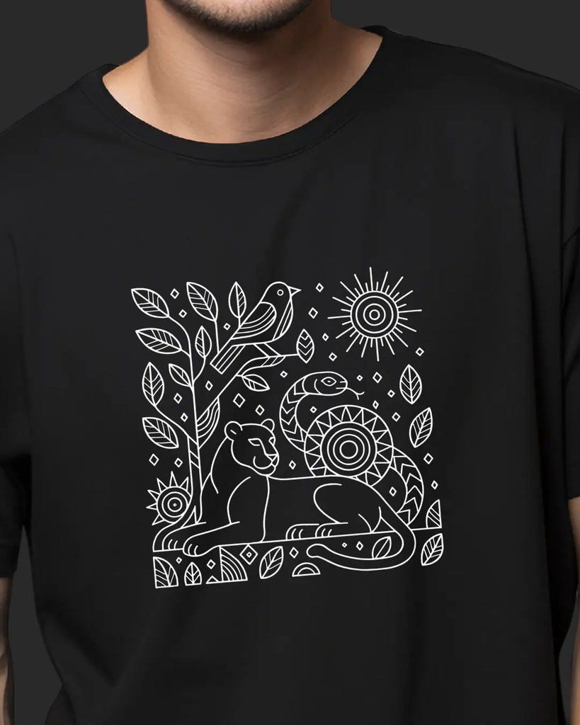Print: In this tribal-inspired design, a sinuous snake, a regal big cat, and a vigilant bird encircle a radiant sun. Their stylized forms interlock, symbolizing the interconnected roles of predator, guardian, and guide in the jungle. Each creature — from the watchful bird to the coiled serpent — represents an element of nature’s primal story. This bold folk-art print evokes ancient legends and the unity of all life under the cosmic sky.