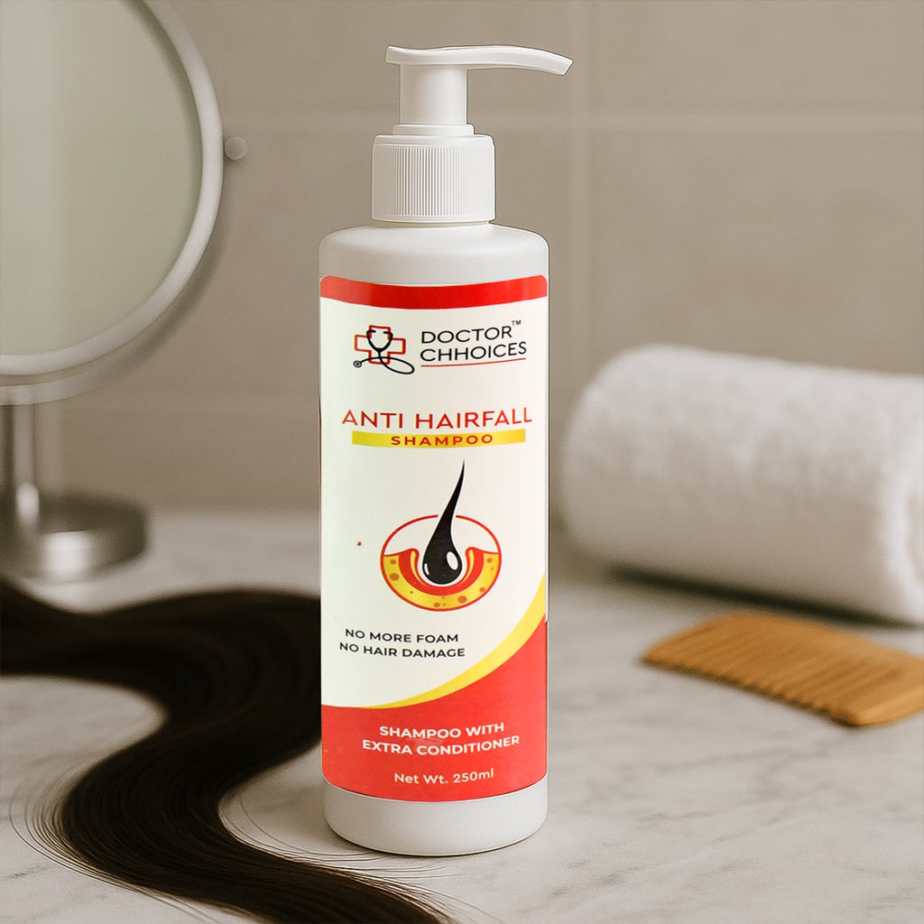 Doctor Choices Anti Hairfall Shampoo is a premium herbal formulation designed to reduce hair fall and strengthen the roots. Infused with time-tested natural ingredients like amla, coconut oil, and other nourishing herbs, it deeply conditions the scalp while cleansing impurities. The unique “No Foam, No Damage” formula ensures minimal harshness, making it safe for regular use.